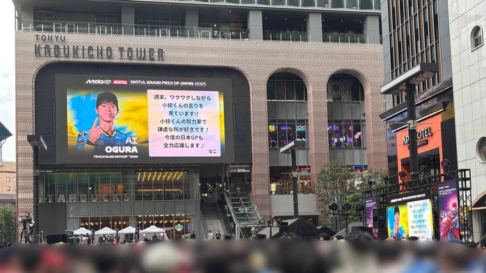 - それに先立ち、 9/24(水)に歌舞伎町シネシティ広場で実施する公式イベント「MotoGP™ in Tokyo」会場ビジョンと新宿ユニカビジョンにて、ファンの皆さんから寄せられた”推しライダー”への応援メッセージ広告を掲出します。