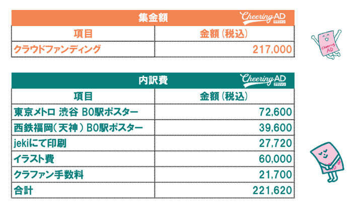 プロジェクト成立に必要な目標金額は、「Cheering AD クラファン」プロジェクトぺ―ジに掲載しています。