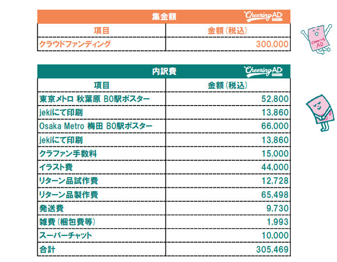- 広告出稿費、印刷費、イラスト依頼費、リターン品(梱包、発送費含む)