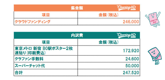 プロジェクト成立に必要な目標金額は、「Cheering ADクラファン」プロジェクトぺ―ジに掲載しています。